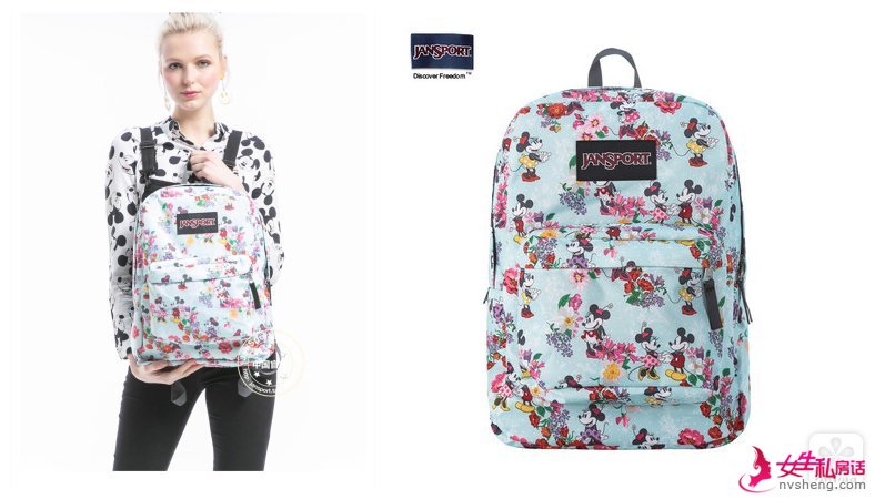 Jansport×迪士尼的合作款,以清新的蓝色为主,碎花元素加上萌萌的米奇米妮,简直不能更可爱!价格:299元。