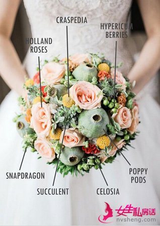花材搭配:金鱼草+荷兰玫瑰+金槌花+鸡冠花+罂粟荚+金丝桃 谁说在绿植界不能出现一束“吸睛”捧花,这束捧花中,最为大胆的花材就是罂粟荚,外表酷似圆滚滚的石榴,但比石榴的花型小,放在捧花上刚刚好,搭配上一些点缀色彩的花材,让“绿色”更显生机。