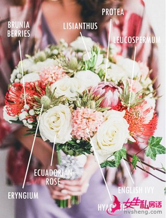 花材搭配:浆果+剌芹属+厄瓜多尔玫瑰+风信子+洋桔梗+山龙眼+风轮花+英国常春藤 靓丽多彩的手捧花,在颜色的搭配上一定煞费苦心,同色花材并不会让捧花看起来有心意,深浅结合,亮暗对比,才是搭配之道。