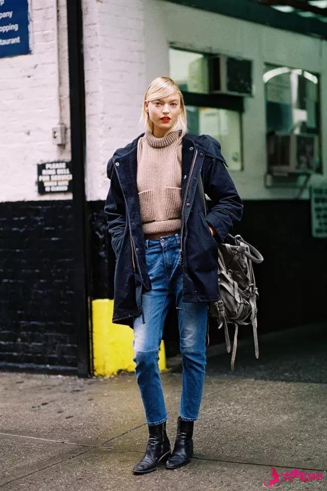 选择本季流行的毛边牛仔九分裤来搭配深色系的高领衫,虽然简约,但是有着浓浓的法式时髦感。选择了一身深色装备也不要紧,编织面料的高领毛衫保暖又美好,如果想要夺人眼球,只需要选择一双本季最为时髦的银光闪闪的金属感皮靴。