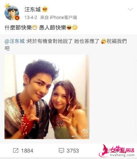 2013年4月,汪东城曾晒出两人的照片“宣布恋情”。