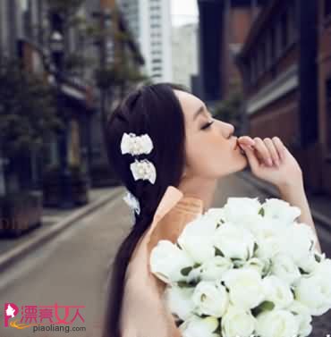 这款发型是不是很符合这个浪漫的暖冬呢?先是将发丝进行粗线条编发再与剩下发丝一起扎成马尾, 唯美浪漫。白色蝴蝶发卡更是给整个造型都加了分。